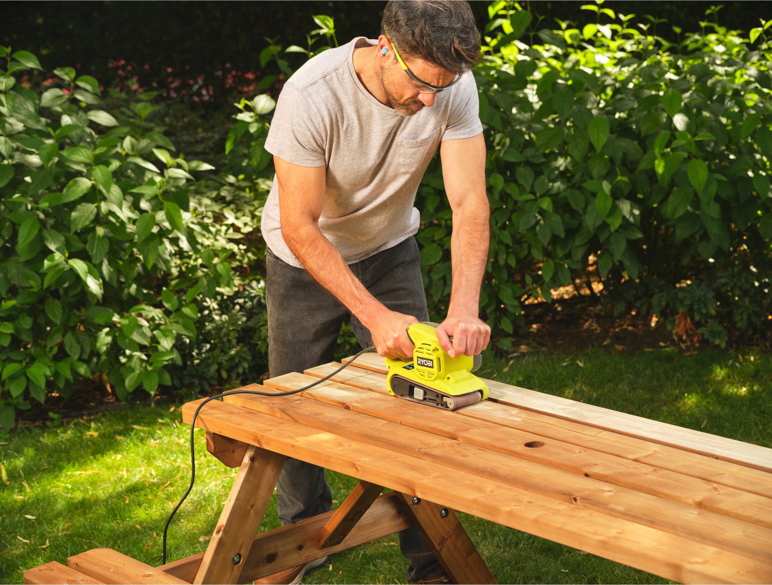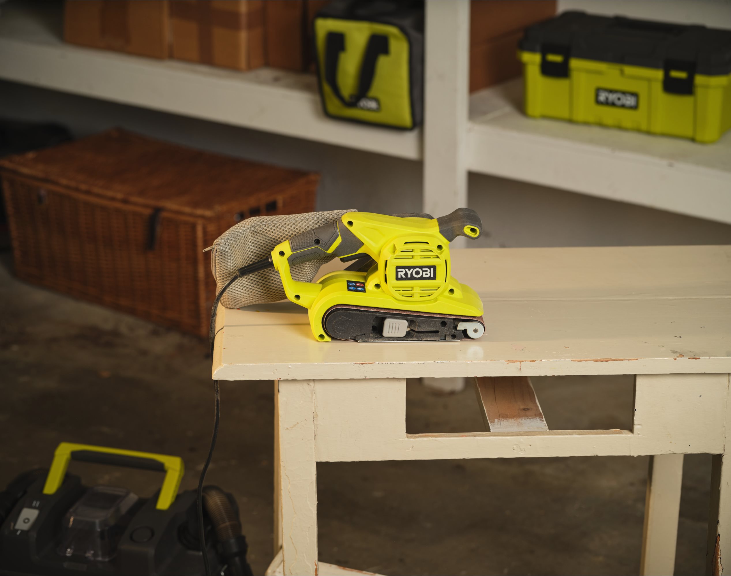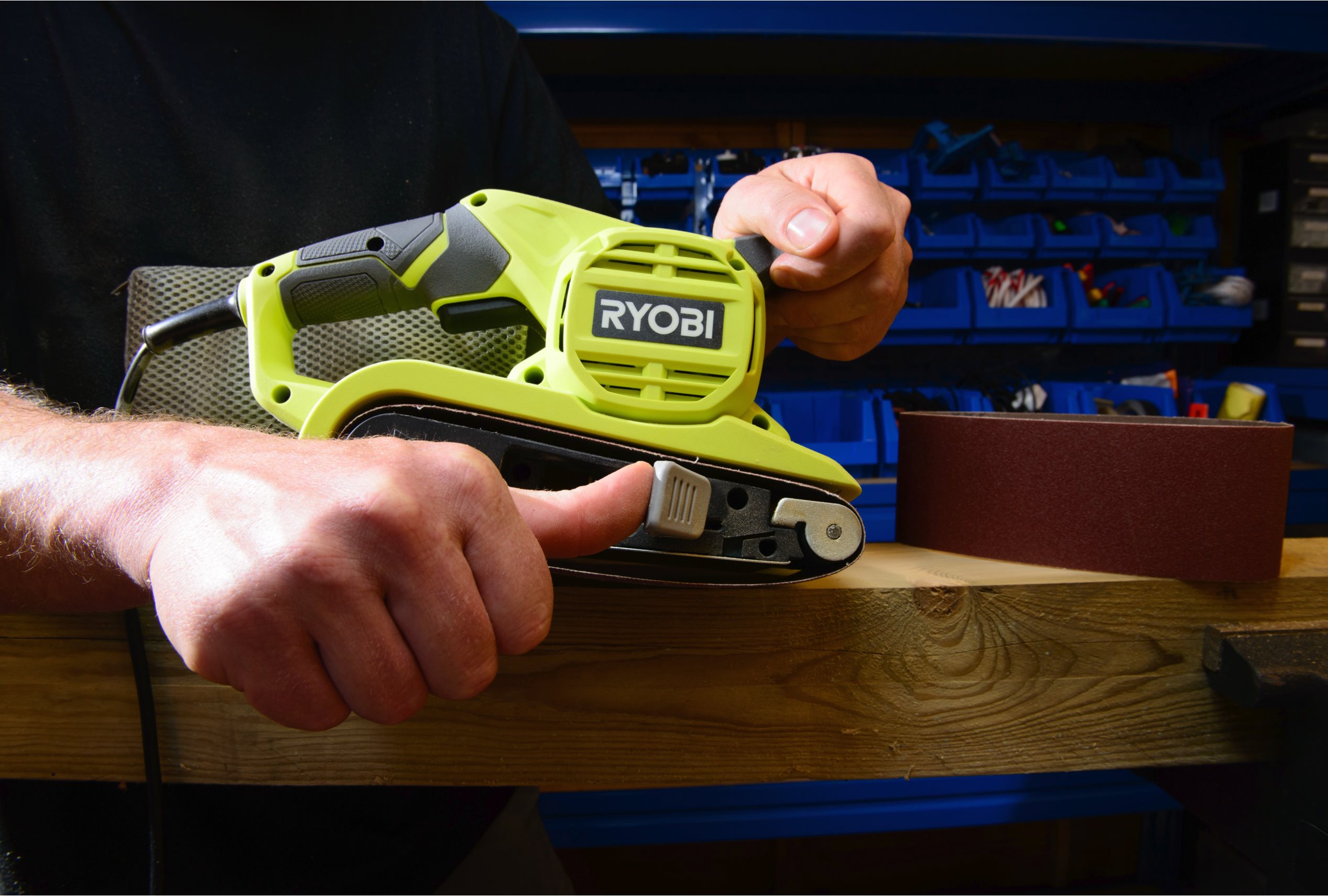 RYOBI® 800W båndsliper er perfekt for sliping av gulvbord, dører, gjenbrukstre og mye mer